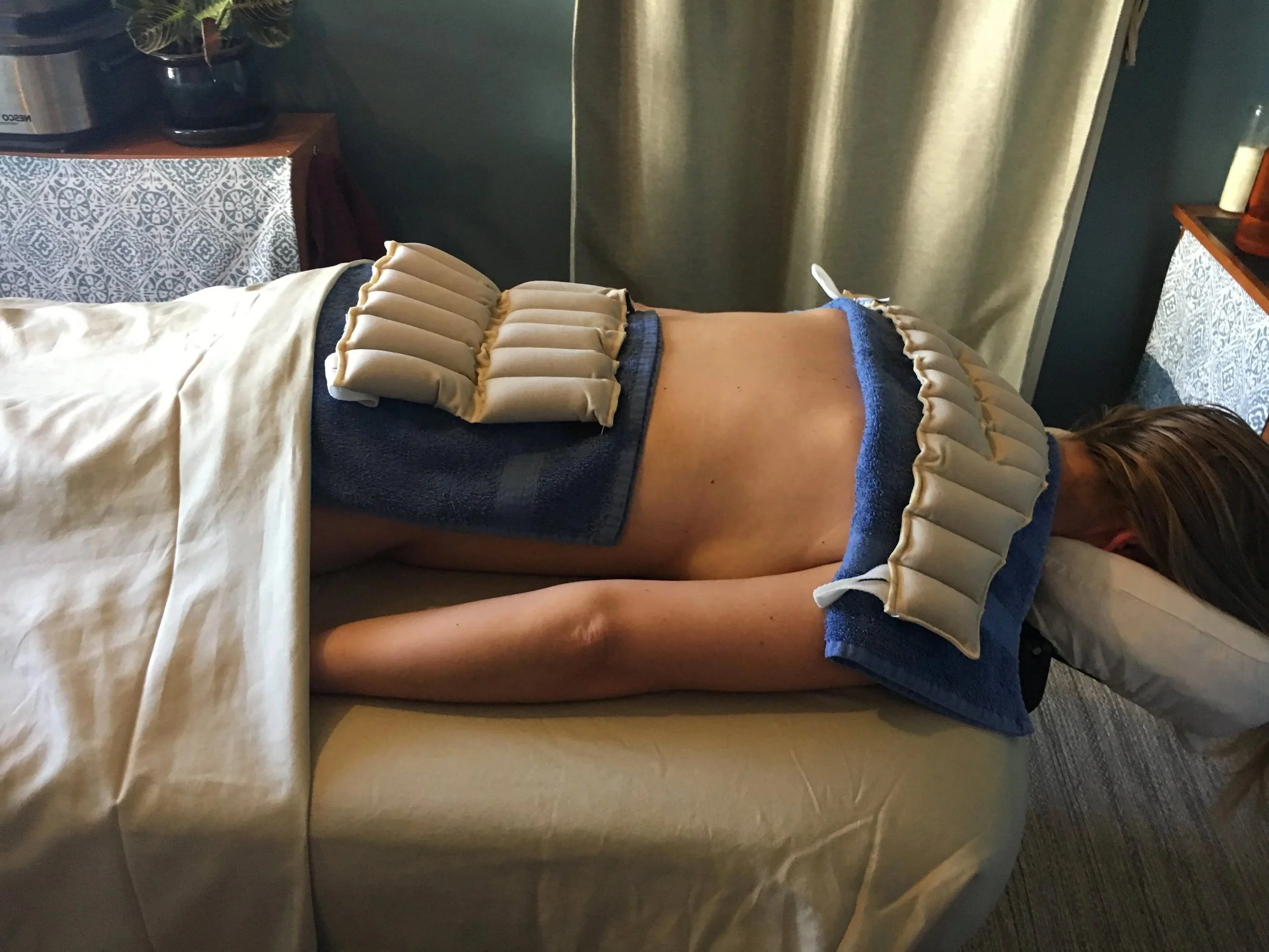 Moist heat packs are applied to increase circulation, reduce muscle stiffness, and help tissues relax. This is especially useful before massage, as warming the area allows muscles to respond more easily to treatment.